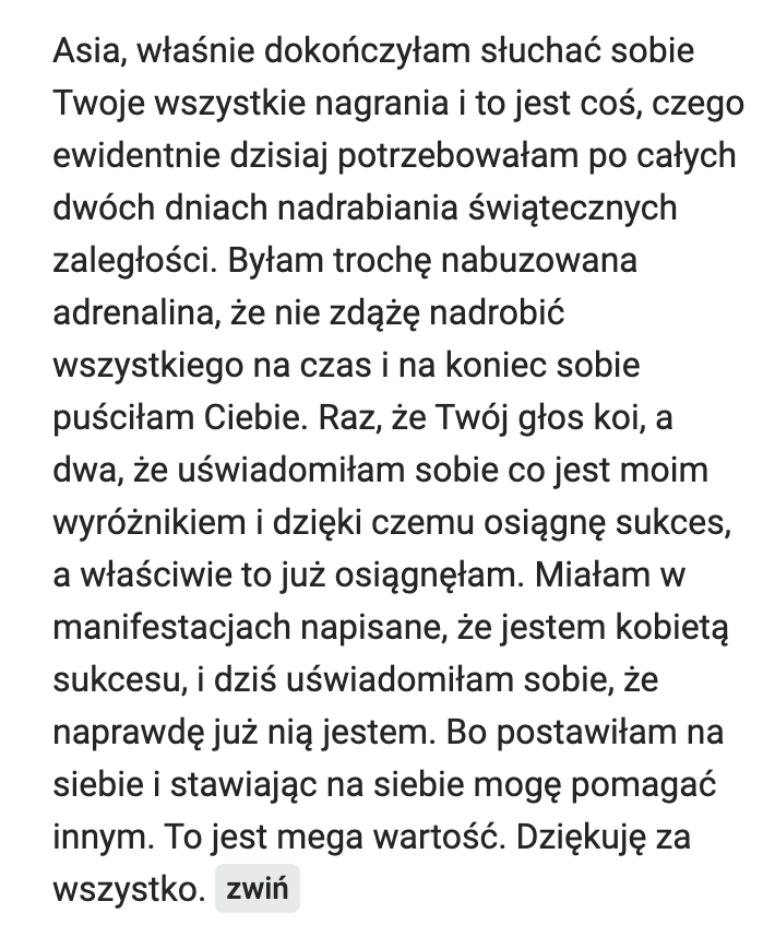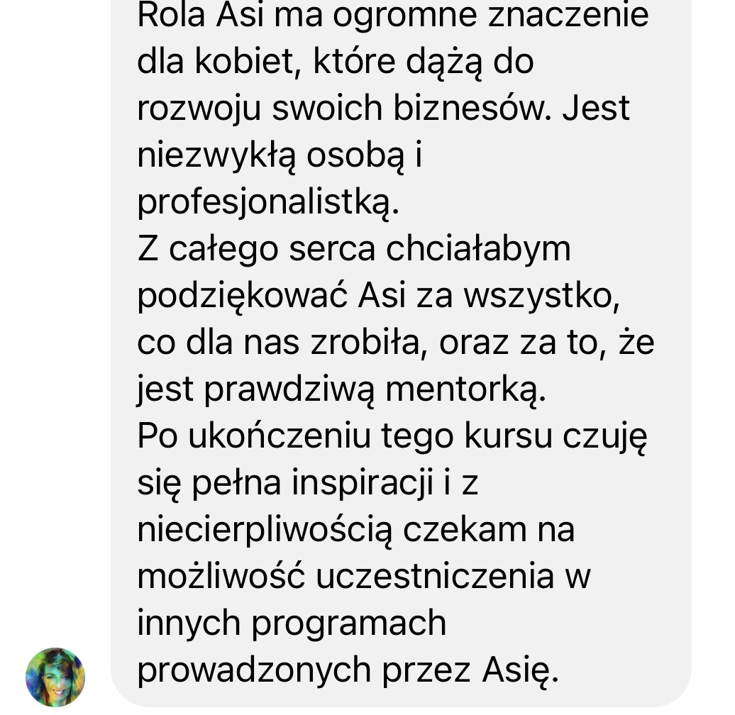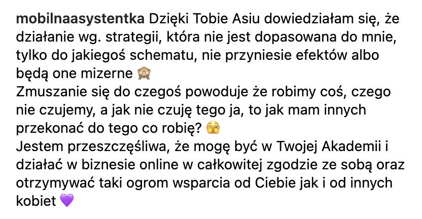 Asiu chciałabym Ci bardzo serdecznie podziękować za stworzenie Akademii Kreatorek Biznesu, to co stworzyłaś i Twoje zaangażowanie naprawdę dodały mi powera do działania i odwagi w podejmowaniu decyzji. Bez Twojego wsparcia nie wiem, czy zdecydowałabym się na ten trudny, ale bardzo ważny etap w moim życiu. Dzięki Tobie zaczynam czuć się pewniej i jestem bardziej zmotywowana do działania. To, co robisz i Twoje doświadczenie,