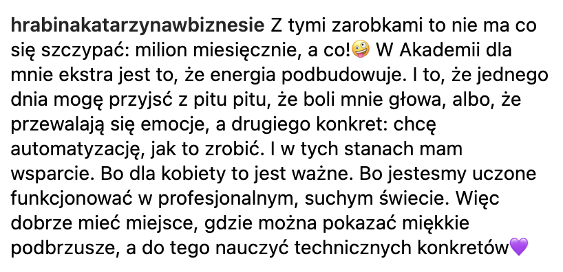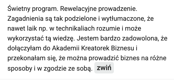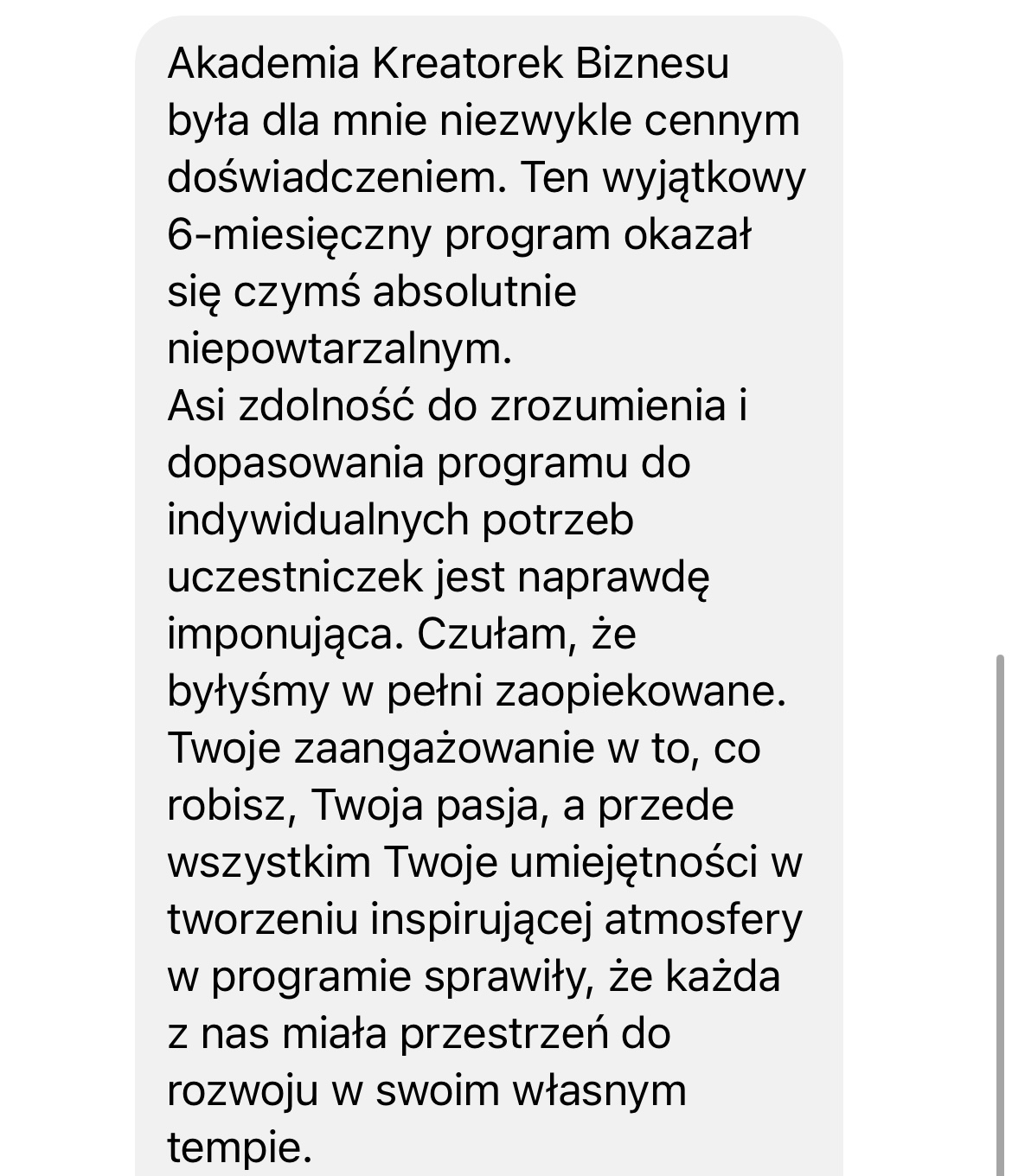 z innymi kobietami. Akademia Kreatorek Biznesu, stała się dla mnie prawdziwym źródłem inspiracji i wiedzy, a Ty spowodowałaś, że właśnie spełniam swoje marzenie, czasem sama w to nie mogę uwierzyć, a to dopiero początek.