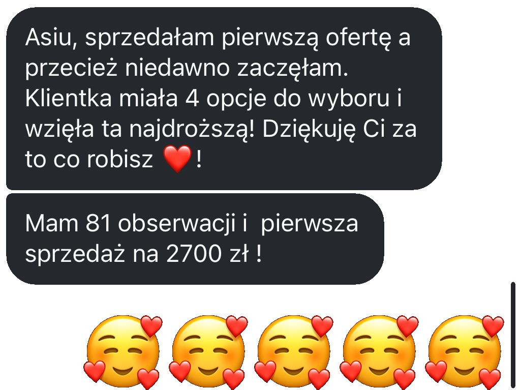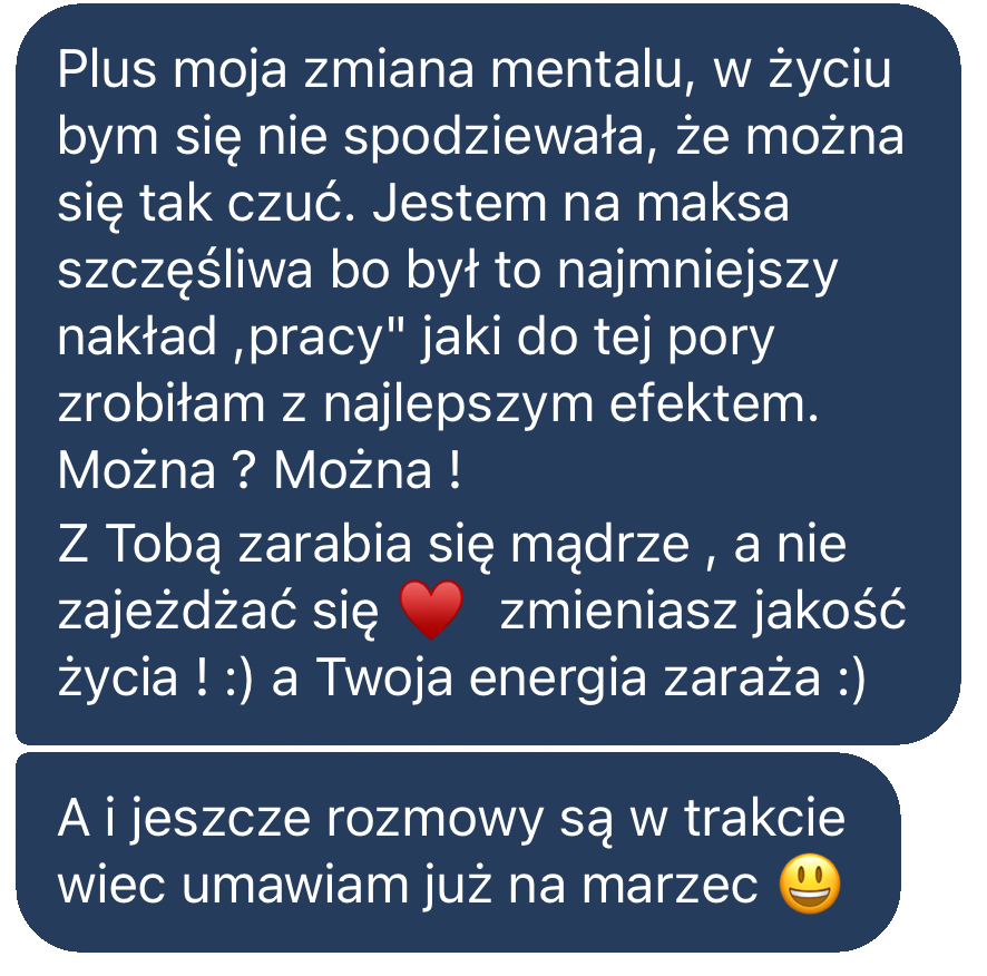 Jestem z Tobą na każdym kroku, odpowiadam na pytania, analizuję Twoje działania i pokazuję, co poprawić, abyś mogła osiągać stabilne, wysokie dochody bez stresu i chaotycznej pracy.